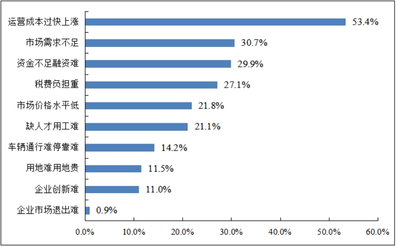 被调查企业中,超过一半的企业反映限制行业发展最大的问题是运营成本过快上涨,包括能源、人力、用地、资金等成本压力持续加大,中小微企业抗风险能力不足,行业亏损面加剧将无法保障吸纳就业,增加社会不稳定。