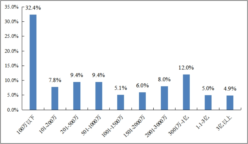 被调查企业收入规模较小,近三分之一的企业近三年平均主营业务收入规模在100万元以下。调查数据显示,40%的企业收入规模在200万元以下属于微型企业,37.9%的企业收入规模在200万-3000万元属于小型企业,17%的企业收入规模在3000万-3亿元属于中型企业。