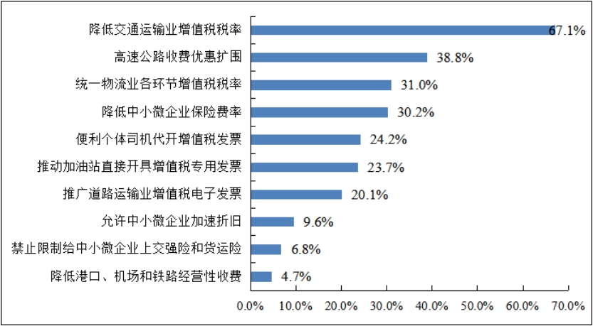 希望获得的税费支持政策排名第二的是高速公路收费优惠扩围。企业反映,高速公路由原来的计重收费方式改为按车(轴)型收费方式,空车、轻泡货运输为主的快递车辆,单程运输为主的冷链、车辆运输车等车辆通行费上涨较多,导致这些车辆选择走国道,增加了国道拥堵也浪费了高速公路资源,亟需出台更具针对性的措施引导空车等回流高速。