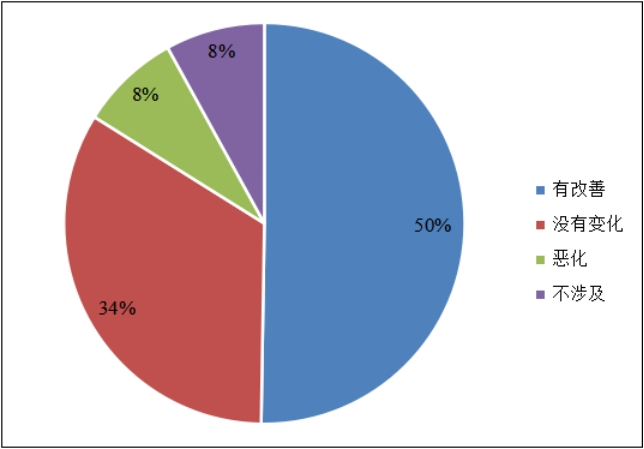 中小微物流企业反映车辆通行环境较上年总体改善。调查数据显示,有一半的企业反映车辆通行环境较上年有所改善,也有34%的企业反映通行环境较上年没有变化。企业总体反映,高速公路通行环境好于国省道。