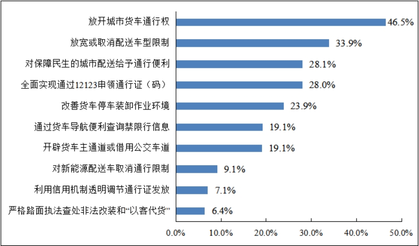 排名第三的是对保障民生的城市配送给予通行便利。这也是《指导意见》提出的,对于冷藏运输车、搬家配送车、快递邮政车等保障民生的城市配送车辆放宽通行限制。为保障货车通行,部分企业希望开辟货车主通道或借用公交车道,以避免公共资源浪费。