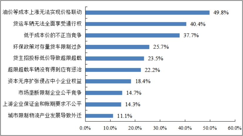 被调查企业认为物流市场特别是公路货运市场存在的低于成本价不正当竞争。据《2021年货车司机从业状况调查报告》显示,货运互联网平台已经成为个体司机寻找货源的重要渠道。对于个体司机货运互联网平台使用中存在的问题,反映最大的是压低运价行为,78.8%的司机认为存在压低运价行为,占比接近八成。这对于中小微企业也是面临同样的问题,低于成本价的不正当竞争扰乱了市场秩序,导致中小微企业利润水平过低无法投入再生产。