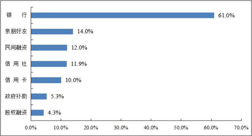 被调查企业融资渠道较为单一。调查数据显示,61%的企业主要通过银行来获取资金,11.9%的通过信用社获取资金;通过亲朋好友借贷、民间融资以及信用卡等方式获取资金的合计占三分之一,通过股权融资方式获取资金的占比仅为4.3%。