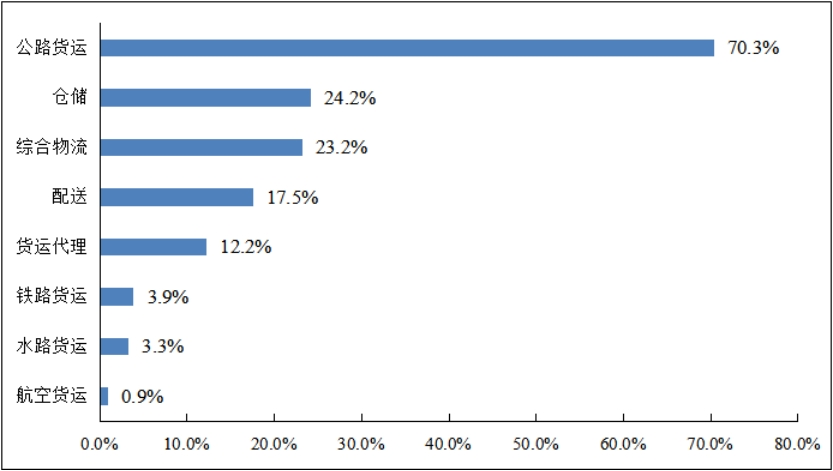 中小微物流企业主要经营业务集中在公路货运领域。调查数据显示,被调查企业从事公路货运业务的占比为70.3%,其次为仓储和综合物流业务占比分别为24.2%、23.2%,从事铁路、水路、航空货运的占比相对较少,尤其是航空货运占比仅为0.9%。这也反映公路货运市场与其他领域相比规模巨大又较为分散。