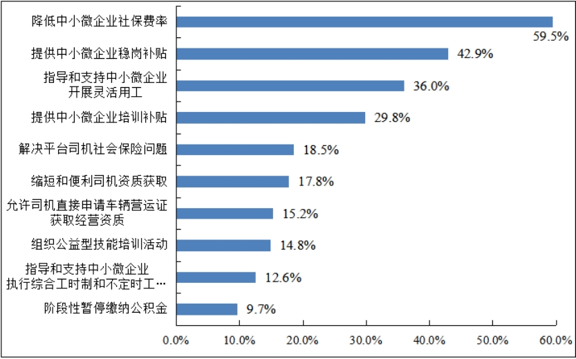 近两成的企业希望解决平台司机社会保险问题。近年来,随着平台经济的发展,中小微企业使用平台来寻找车源日益普遍。但是平台上的司机大部分是个体性质,没有工伤保险等社会保险导致出现事故后企业纠纷难以解决。