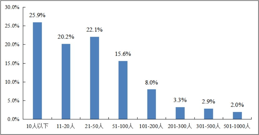 被调查企业有近七成平均员工人数在50人以内,其中四分之一的平均员工人数在10人以内,不到一成的企业员工人数在200人以上。