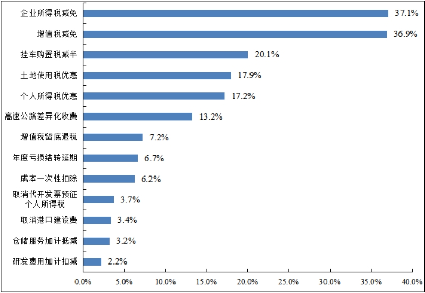中小微物流企业亟需加大税费支持力度。根据被调查企业反映已享受的税费优惠政策来看,行业普惠性政策落实较好。享受企业所得税减免、增值税减免政策的占比较多,分别占到37.1%和36.9%,享受挂车购置税减半政策的企业占20.1%,还有个人所得税优惠占比也较多。