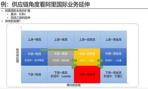 但是一达通带来的巨大流量集聚和物流集聚,让它在整个国际物流端有巨大的空间,所以它们两年以前收购了环世物流,这跟马士基收购利丰物流可以之类比,马士基是从干线物流去往岸上物流延伸,阿里是从国际贸易平台往国际物流去延伸。他们通过信息流发现还有资金流的需求,中小额的支付通过银行支付成本很高,而且不方便,他们就建立了万里汇,形成了一个资金流通道。这是阿里国际的业务,我们可以从供应链角度去看怎样做横向和纵向的延伸。有了这样的逻辑去之后,我们还可以分析很多企业,看他们怎样从商流走到物流,从物流走到资金流。