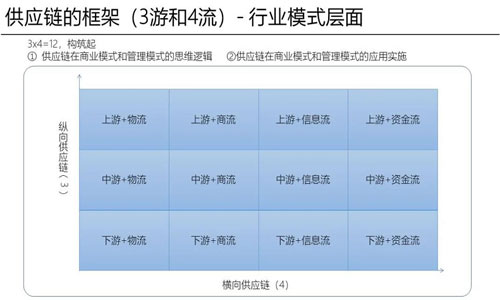 供应链的发展是一个大趋势。2017年供应链被计入GDP科目,并成为我国从高速粗放型发展向高质量集约型发展转变的重要引导力量。同时,商业模式、消费模式、制造模式也正随着社会发展发生变化,物联网、互联网、人工智能、大数据、5G、碳中和等,都成为推动供应链创新、变革和发展的要素。 从宏观层面,要分析这些变化带来的影响,我们需要找到支持企业发展的力量,这个力量从供应链的角度是“3游”X“4流”,即供应链的3X4模型。传统供应链应该包括采购、生产、交付三个层面,如果放到广义层面去看,应该是物流、商流、资金流、信息流这四个流的组合,它们从不同的角度去服务企业;以及企业在行业里面所处的不同位置,即上游、中游、下游。 如果大家在脑子中建立了这个3X4模型,将自己的企业带入其中,也许就能找到当下的定位。这是分析供应链逻辑的起点,同时也可以引申到怎样去看待企业的核心能力和企业的发展逻辑,也是对企业资源的二次开发。