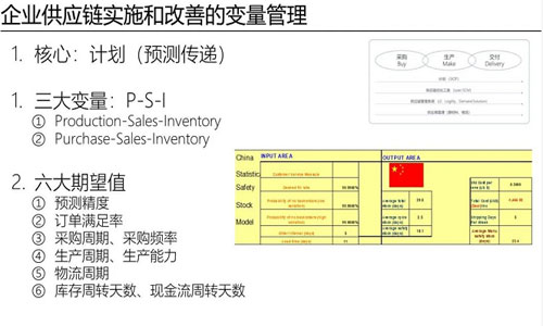三大变量P-S-I,对于制造型企业来讲P是生产(Production),S是销售(Sales),I是库存(Inventory)。对于贸易型的企业来讲P是采购(Purchase),S是销售(Sales),I是库存(Inventory),所以P-S-I是供应链的三个变量。 三大变量是通过怎样的二级变量产生的,就是六大期望值。预测精度,订单满足率,采购周期、采购频率,生产周期、生产能力,物流周期、库存周转天数、现金流周转天数。总结下来有12个变量,带来六个大的期望值。像预测的精度,要预测到99%和70%,对供应链带来的损耗度不一样。例如订单满足率这块,订单要满足99%和订单满足80%,做到99%虽然成本很高,但是如果是80%的话,供应链的成本也许不高了,但是客户的体验就差了。 采购周期和采购频率结合,就是采购的把控能力,带来采购成本的优势。生产周期和生产能力,生产现在已经变成供应链能力了,过去是独立在供应链以外的。你的产能高,生产的设备好,成员工人的熟练度好,不同产品之间的换档时间短,产能可以8小时、16小时、24小时连轴转,都带来供应链的巨大优势。物流周期,物流周期短,说明你的库存周转率会提升。如果物流成本上升,就要平衡库存的成本和资金成本的比例,这就是供应链里面可以做技术性优化的地方。 最后,就是库存周转天数和现金流的周转天数,这个是冰山下的成本,别人看不到。把库存周转天数降低,对企业的现金流和企业的资金成本会有很大的用处。现金流也是一样,假设一年周转6次,两个月周转1次的话,一个亿能够产生六个亿的销售额。单纯从货物的周转角度,不看其他的成本,如果你的周转率是12次,1个亿能够产生12亿的销售额,如果是24次1个亿就能产生24亿的销售额,这就是供应链带来的对资金成本巨大的支持和对企业巨大的影响。这就是供应链从企业角度,从操作层面和术的角度来讲,能够为制造型企业、贸易型企业,以及信息型企业、研发型企业提供的经营管理思维,逻辑上都是一样的。