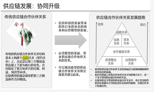供应链是一个协同关系,随着科技的发展和运营模式的变化,可以预计一下,可能现在很多企业都在把供应链关系往信用和契约关系两个维度去发展,而不仅仅是合同上的关系。 如果你是一家快速发展的企业,而且有大量的资本支持,另外你又看好这个赛道,叫“野蛮生长”也好,还是叫“高速生长”也好,不能纯粹地从契约关系构筑供应链能力,必须要把信用关系构筑上去,契约和信用两个维度形成了供应链的上游能力或者是服务能力。服务能力指的是用外部的物流服务和上游采购服务支撑供应链体系,体系里面是一个金字塔型,它有战略关系上的合作,也有资本。