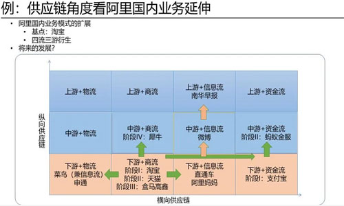 以阿里的国内业务为例,可以看到3X4模型的具体应用。阿里国内业务从淘宝发展到天猫,天猫发展到新零售的盒马和并购高鑫,这是商流发展阶段。在商流发展过程中,由于淘宝天猫带来大量的快递需求,于是建立了菜鸟物流。而菜鸟物流不仅仅是一个物流平台,也是信息流平台。并且阿里从控股到全资了申通,不断延伸仓配体系。商流作为核心向物流和信息流延伸。信息流业务还有直通车、阿里妈妈等,在总收入占比中非常高。 通过供应链中的商流,延伸出最有附加值的信息流服务,信息流又往上游去延伸。因为有商流又带动了资金流,做出支付宝,变成买家和卖家之间信用的桥梁。在这个过程中大家发现在商流方面又往上去延伸,延伸到最近的犀牛智能制造,这是商流往制造端去延伸,制造端再去往采购端延伸。 从供应链角度去看阿里的发展,即从商流作为一个核心,带来大量的流量以后,既在商流上变现,又在物流、信息流和资金流上变现,并且逐步扩大它的版图,这是从供应链的角度去分析,基点是在淘宝,这是阿里的国内业务。