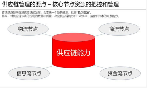 从微观层面,纯粹的供应链就是企业的采购、生产和交付流程。为这个流程服务应该有计划性,也就有了SIOP(Sales, Inventory & Operations Planning)。市场上有很多供应链管理和优化工具,以及供应链管理系统,比如京东和阿里都有自己的供应链系统。随着管理的范围越来越多,包括要管理采购原料商、物流原料商,辐射到企业资金和人员的管理,逐步形成了一些供应链管理的核心节点。 从3X4模型中能看出,不同的物流、商流、信息流、资金流中有很多交叉汇合的节点,不管哪个企业,在任何一个模块里面,不可能把控供应链的所有的节点都囊括其中,一个企业的核心能力就是把控其核心供应链节点的能力,这个能力决定了企业在这个行业里面生存的基础。而且有这个基础后能看到企业将来扩张的空间,和核心能力辐射的空间,这是一个基于供应链发展的基本逻辑。