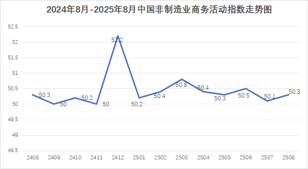 优米官网首页下载、国家统计局服务业调查中心发布的2025年8月份中国非制造业商务活动指数为50.3%,环比上升0.2个百分点。由于非制造业没有综合指数,通常以商务活动指数来反映非制造业经济的总体变化。