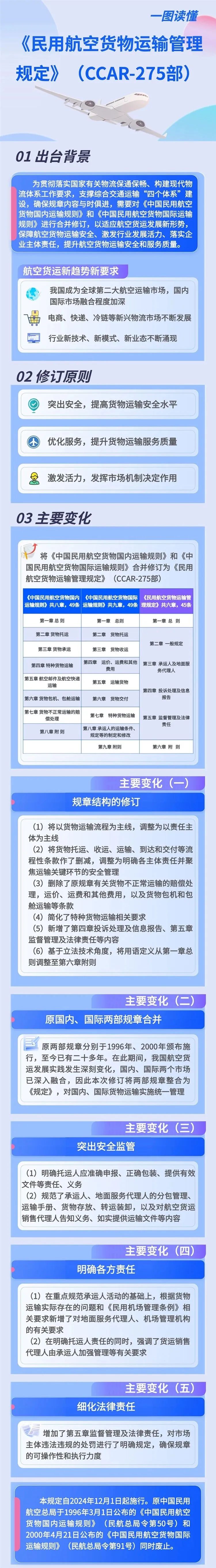 为保障航空货物运输安全,激发发展活力,7月8日,交通运输部发布《民用航空货物运输管理规定》(CCAR-275部)(以下简称《规定》),自2024年12月1日起施行。《规定》突出关键环节安全监管,明确各方市场主体责任,强化货运服务质量要求,统一规范了国内国际航空货物运输秩序,有利于提升航空货物运输安全和服务质量。